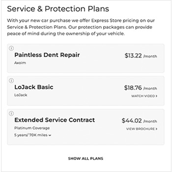 Drive more revenue by prominently promoting your configurable service and protection plans throughout the shopping experience. We work with F&I Express, JM&A, PEN, and others to make sure your F&I menu is complete.